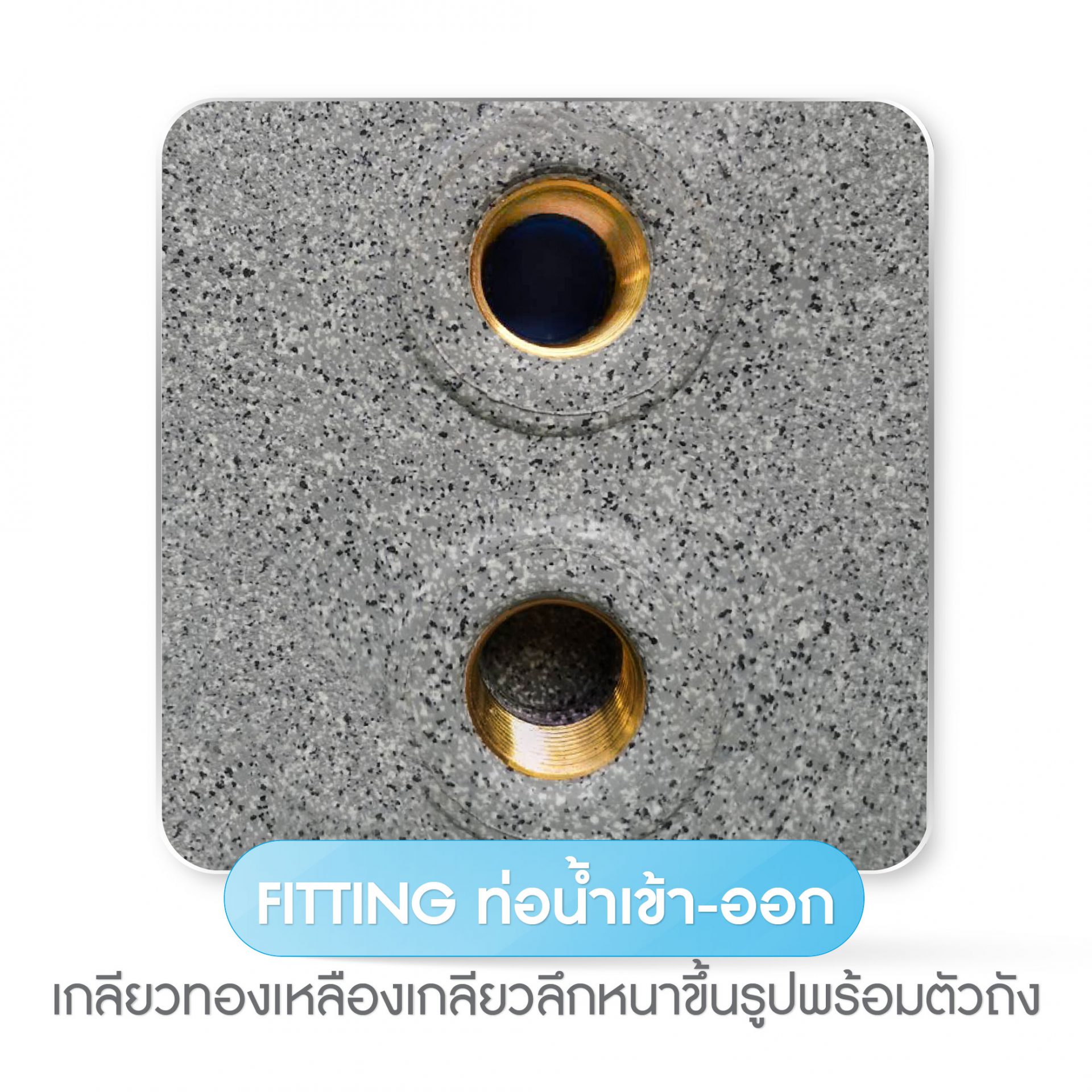 • Fitting น้ำเข้า-ออก ทองเหลืองเกลียวลึกหนา ขึ้นรูปพร้อมกับตัวถังช่วยลดการรั่วซึมกว่าวิธีเจาะใส่ภายหลัง