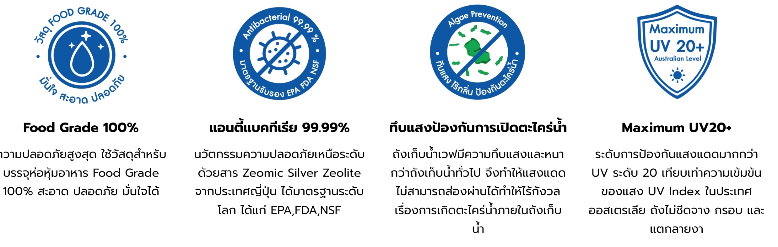 • ป้องกันการเกิดตะไคร่น้ำ แสงแดดไม่สามารถส่องผ่านได้เนื่องจากถังหนากว่าแบรนด์ถังเก็บน้ำทั่วไป