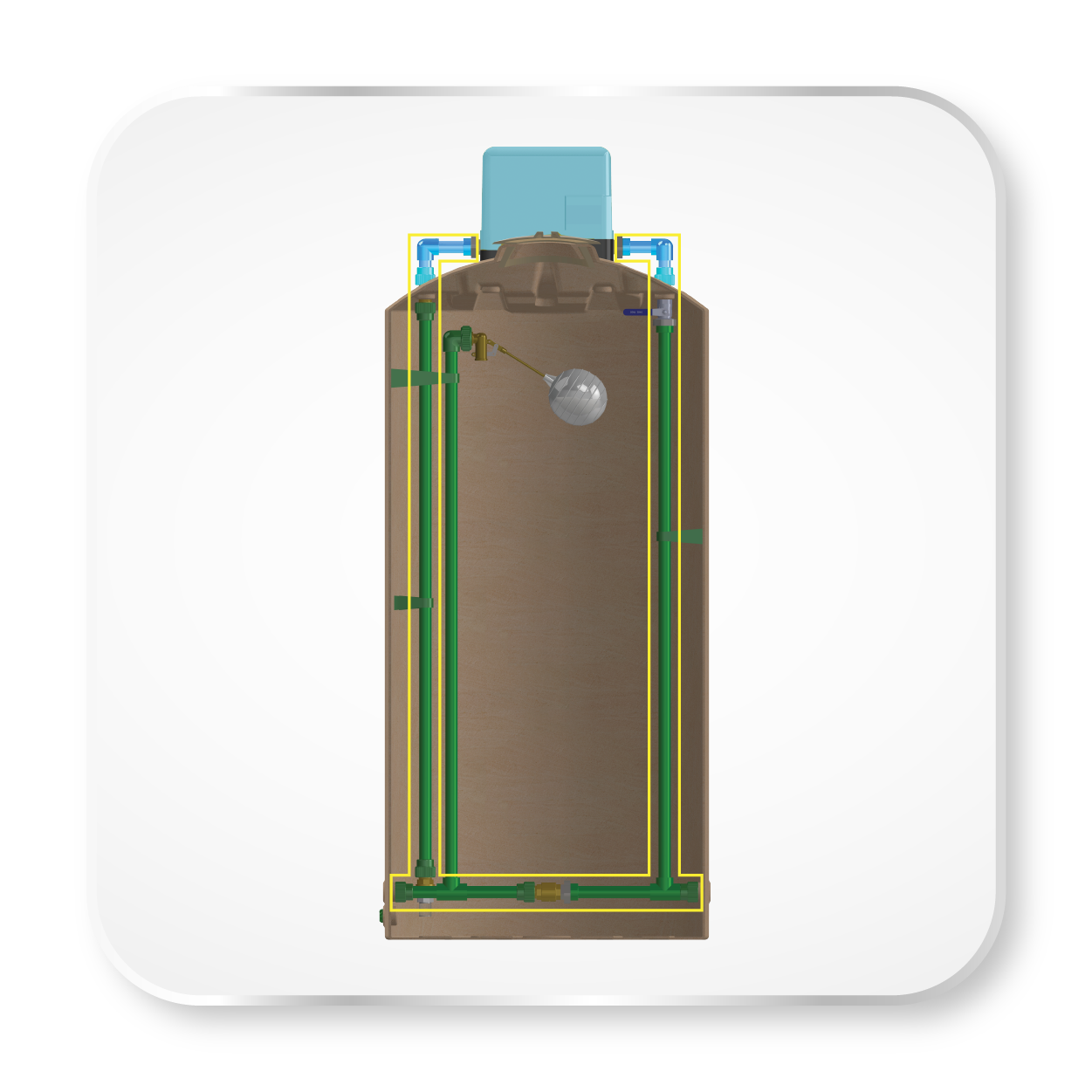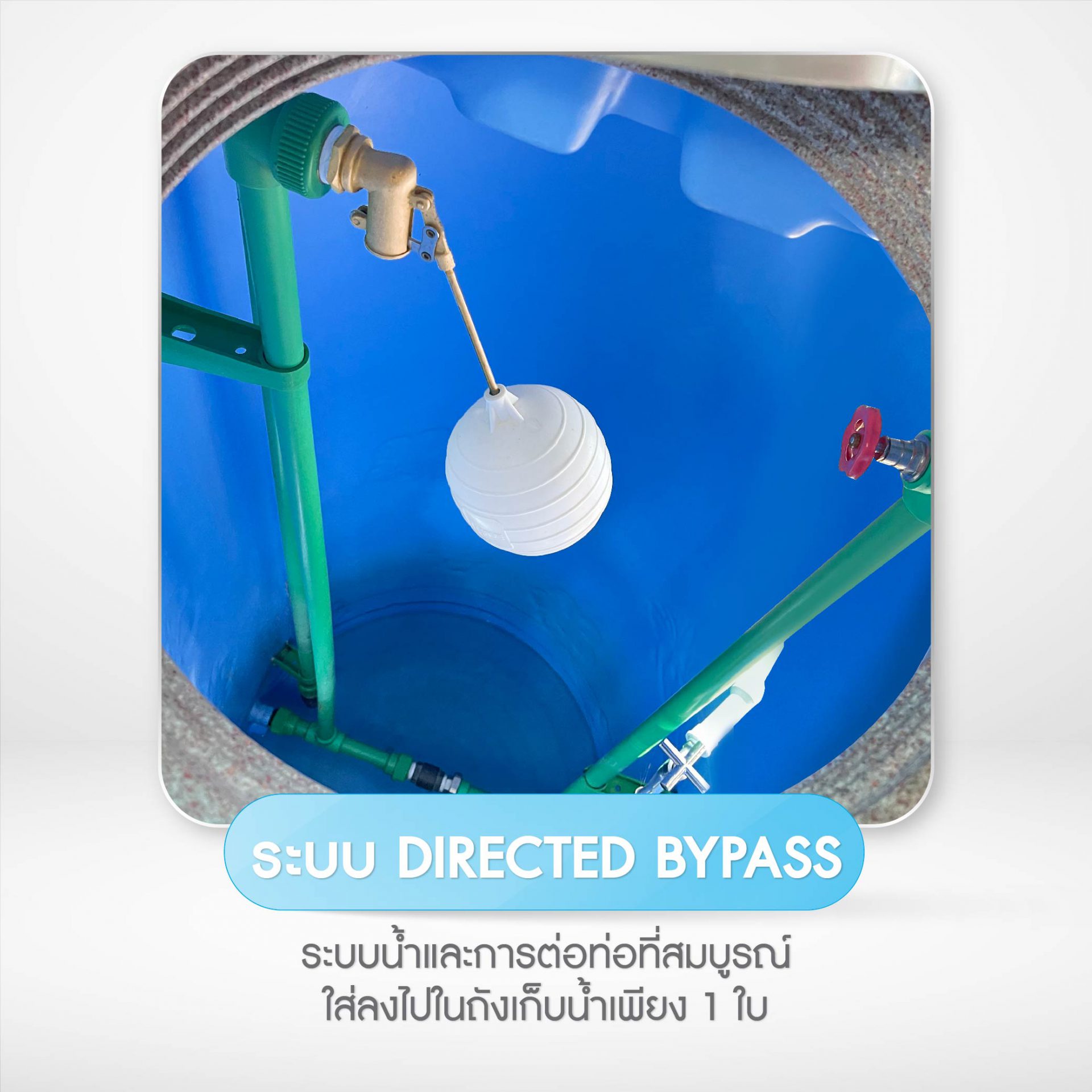 • น้ำไหลแม้ไฟดับ ด้วยระบบ AUTO DIRECTED BYPASS (เดินน้ำแบบ 2 ระบบ) งานระบบภายในตัวถังเก็บน้ำ ลดเวลาติดตั้ง ประหยัดพื้นที่