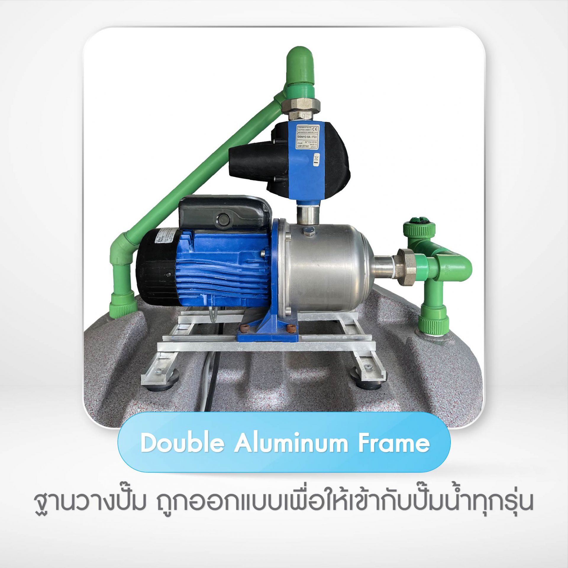 - ถังเก็บน้ำระบบ By Pass ในตัวพร้อมฐานตั้งปั๊ม